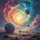 A serene figure stands against a vibrant cosmic backdrop, with swirling nebulae, bright stars, and dust bunnies, illuminating the scene, creating a sense of wonder and exploration.