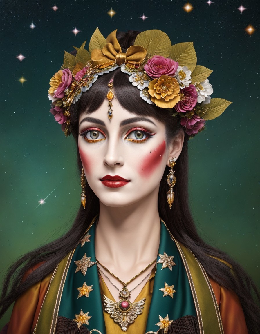 A painting depicts a woman with starry background, floral headdress, Victorian attire, and surreal facial markings.