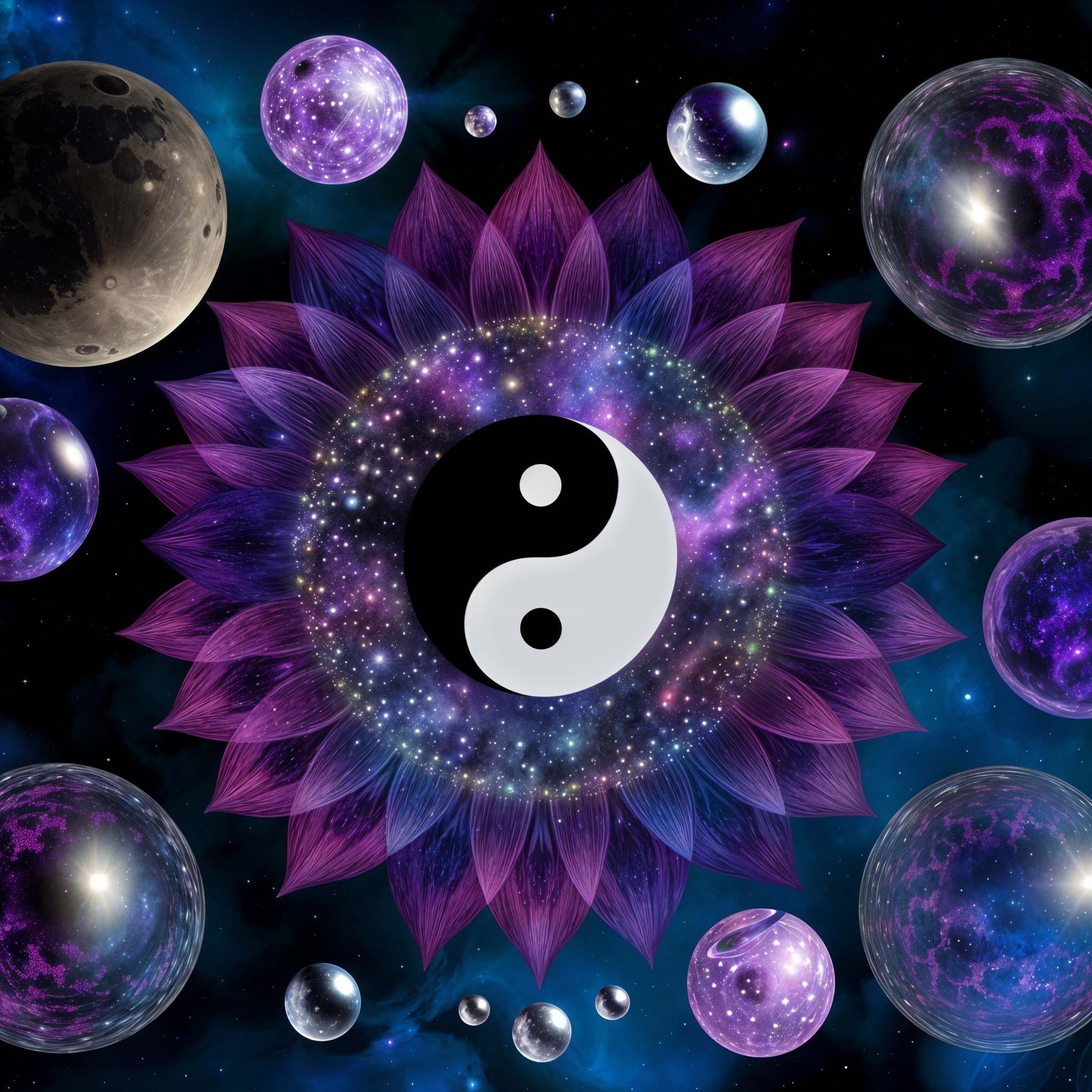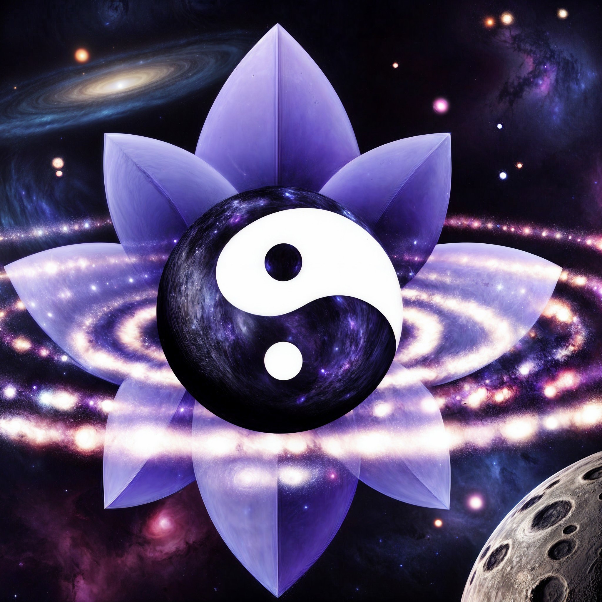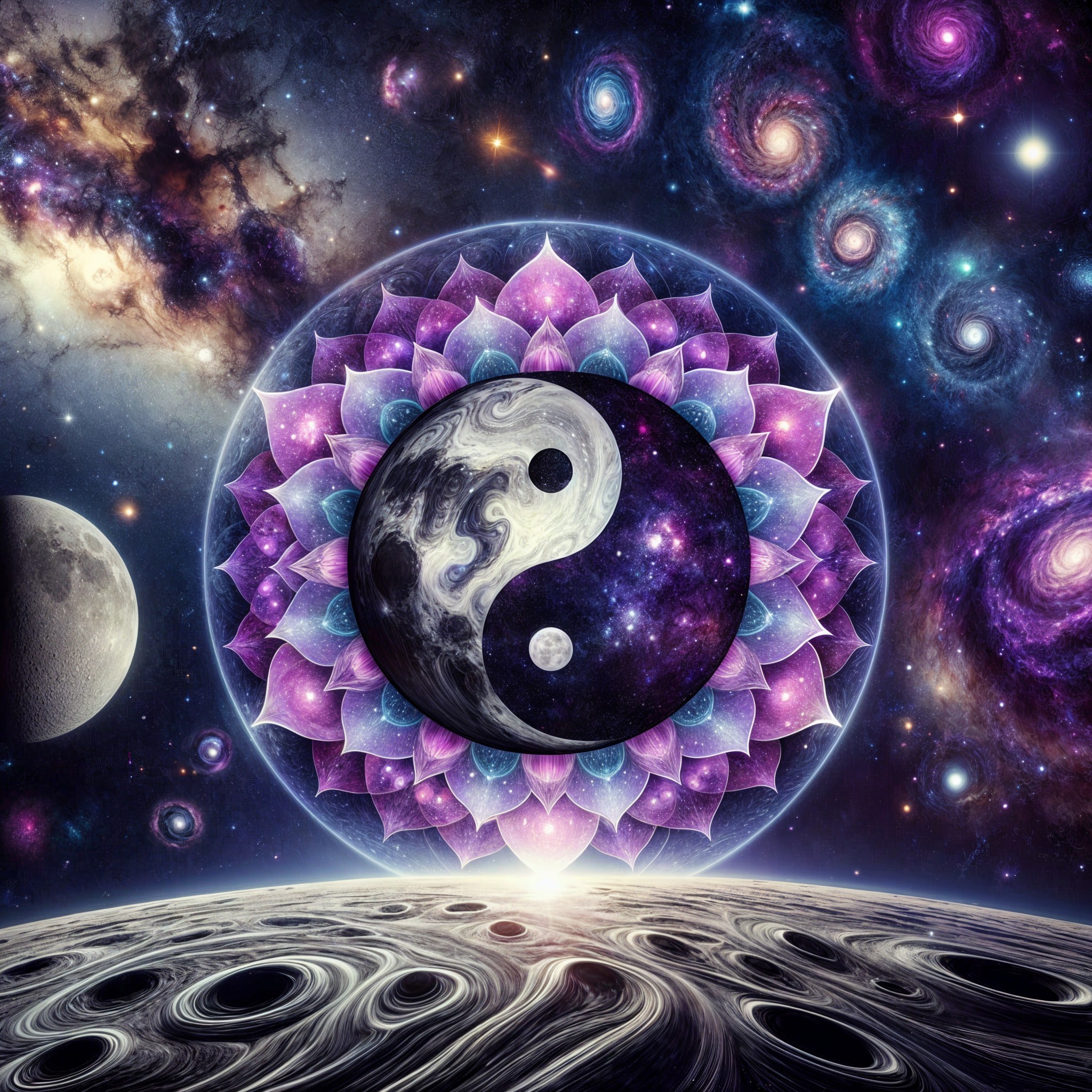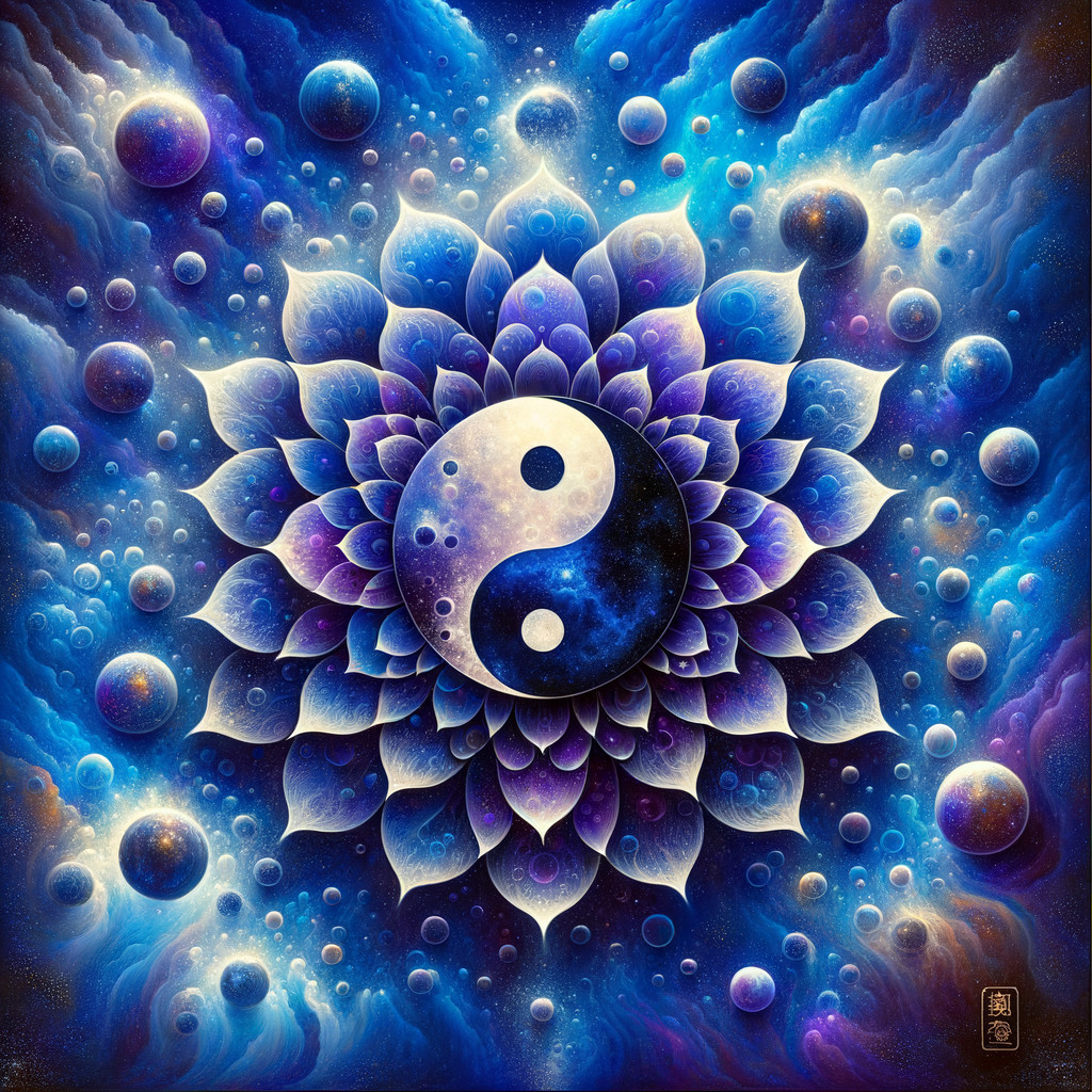 A cosmic yin-yang symbol amidst swirling galaxies, planets, and fractal patterns, evoking a sense of balance in the universe.