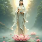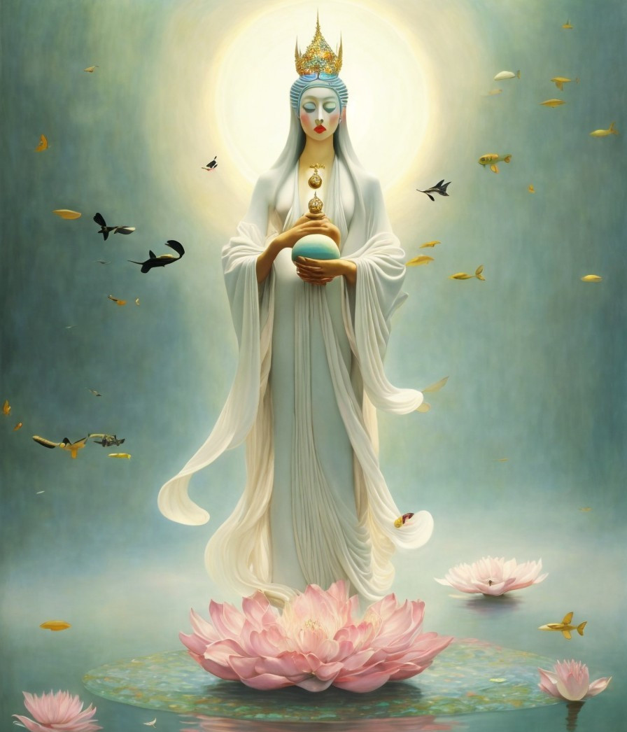 The image features surreal, ethereal figures blending with nature, surrounded by a tranquil landscape. Dreamlike forms and pastel colors create a harmonious and mystical atmosphere.