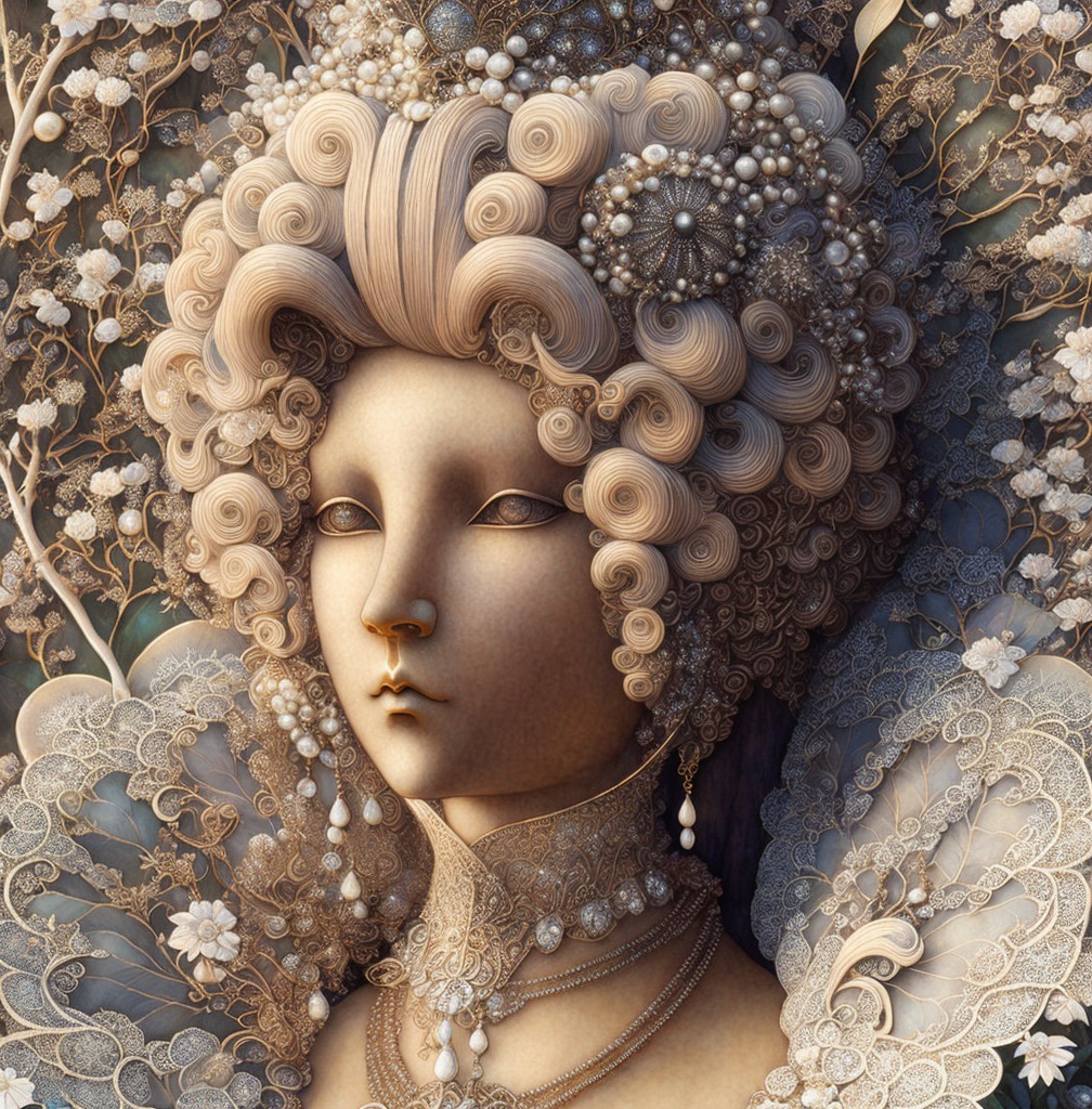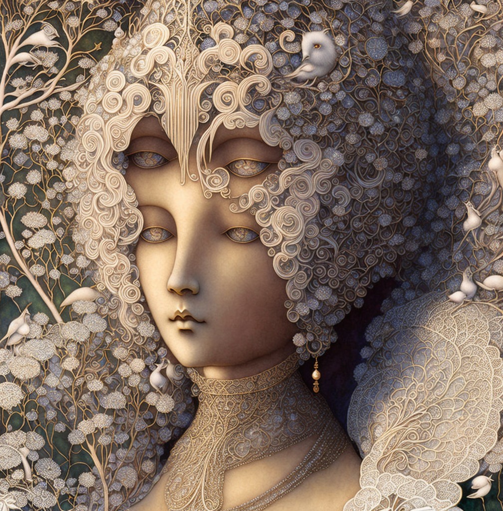 A graceful woman with intricate golden jewelry and a delicate crown adorned with leaves. Her porcelain skin and wavy hair complement a richly detailed, ornate background. A sense of elegance and mystery abounds.