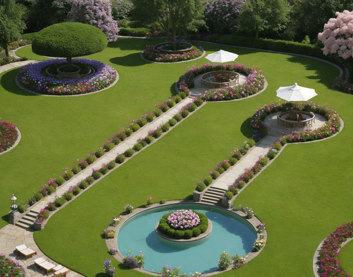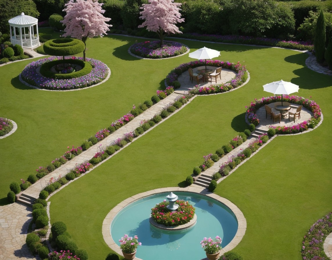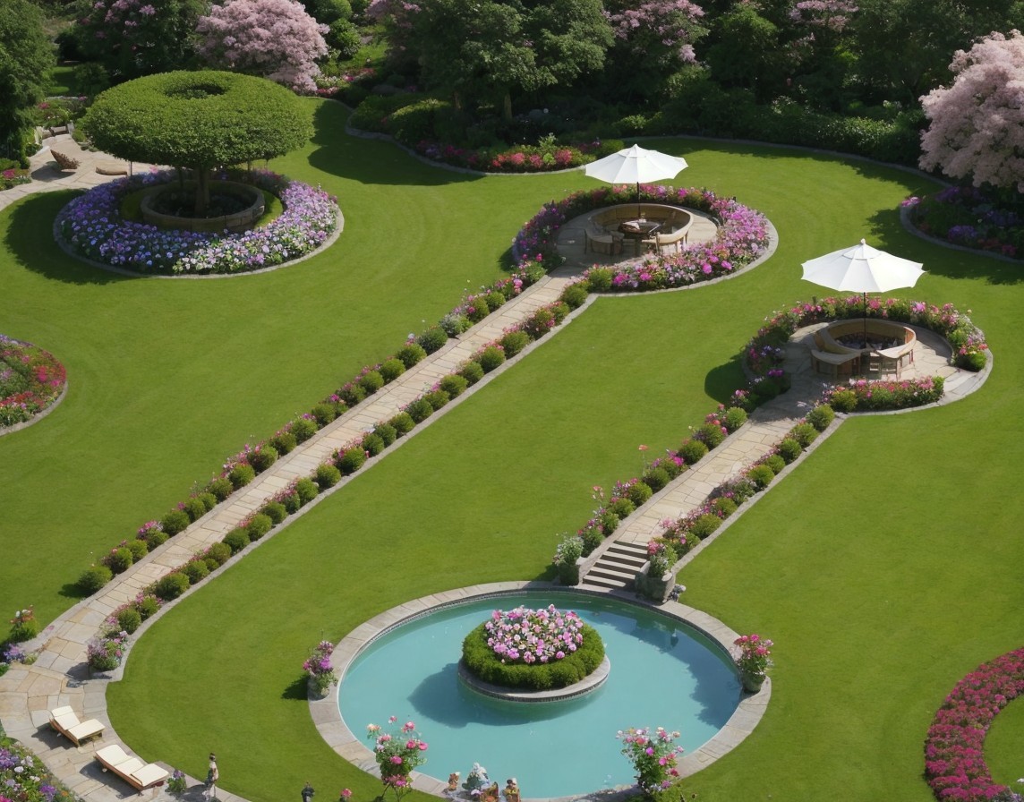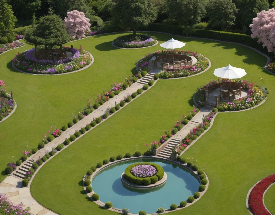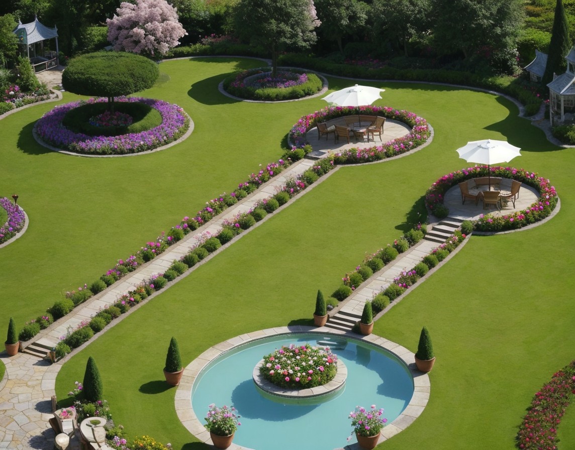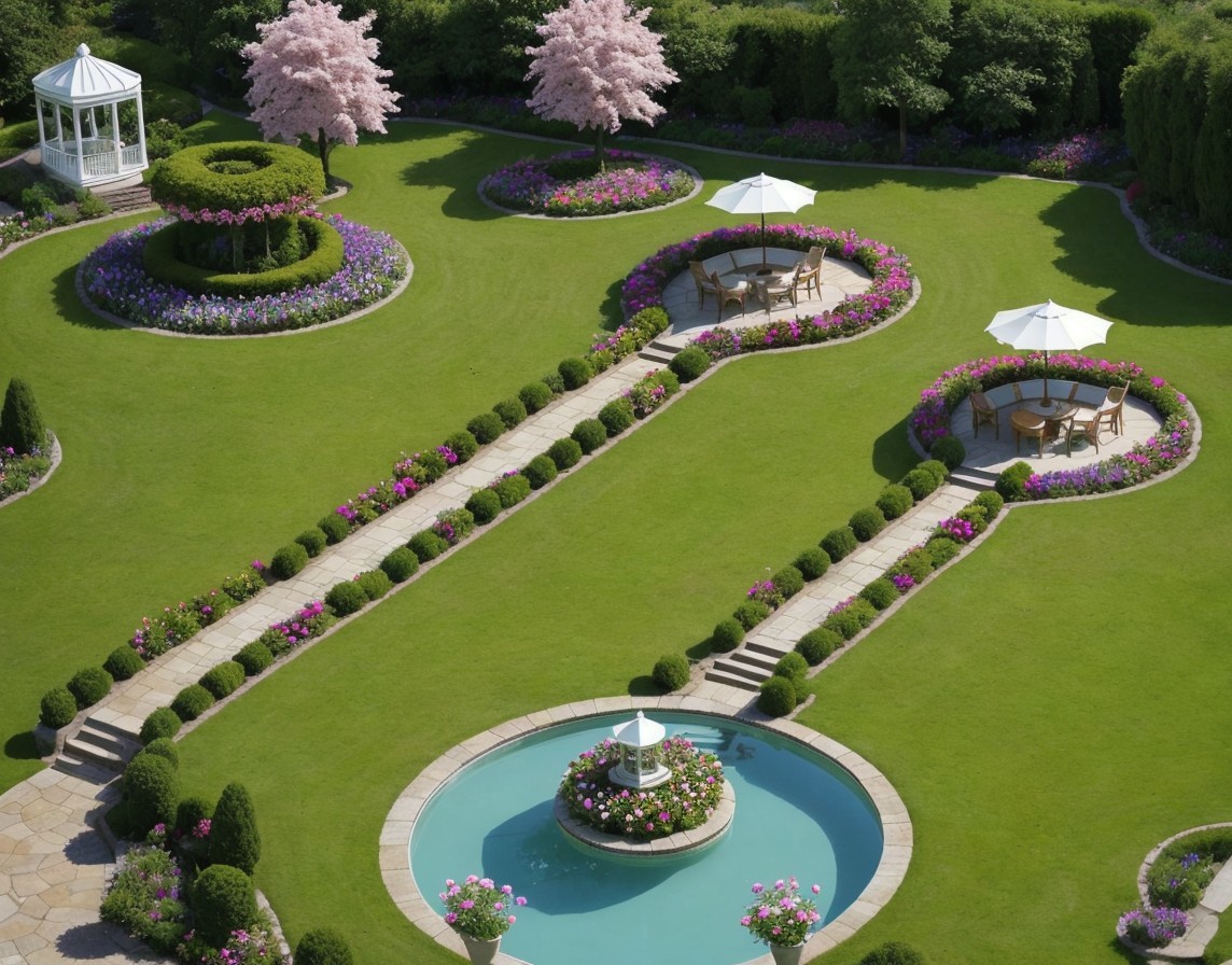 A well-manicured garden with flower beds, a fountain, pink trees, and seating areas under gazebos on a sunny day.