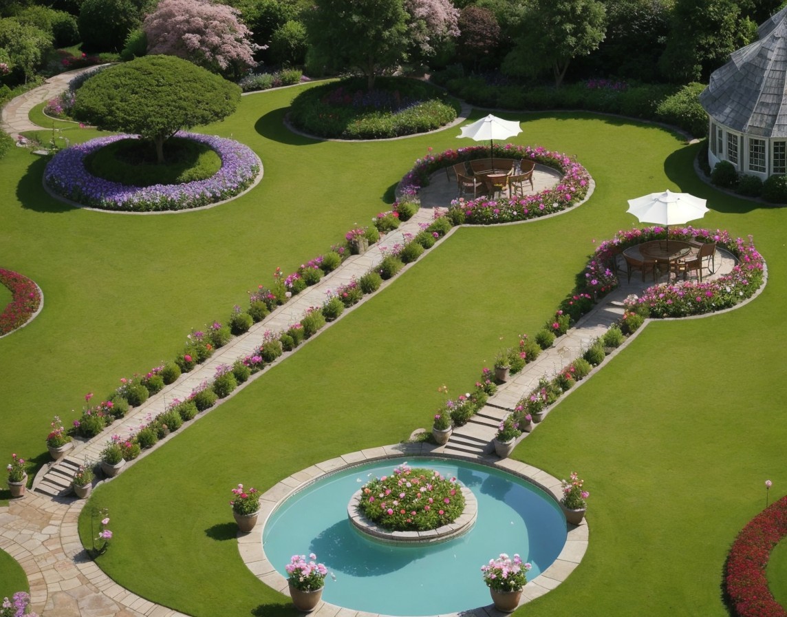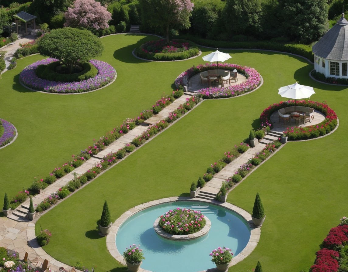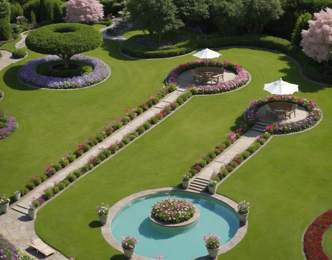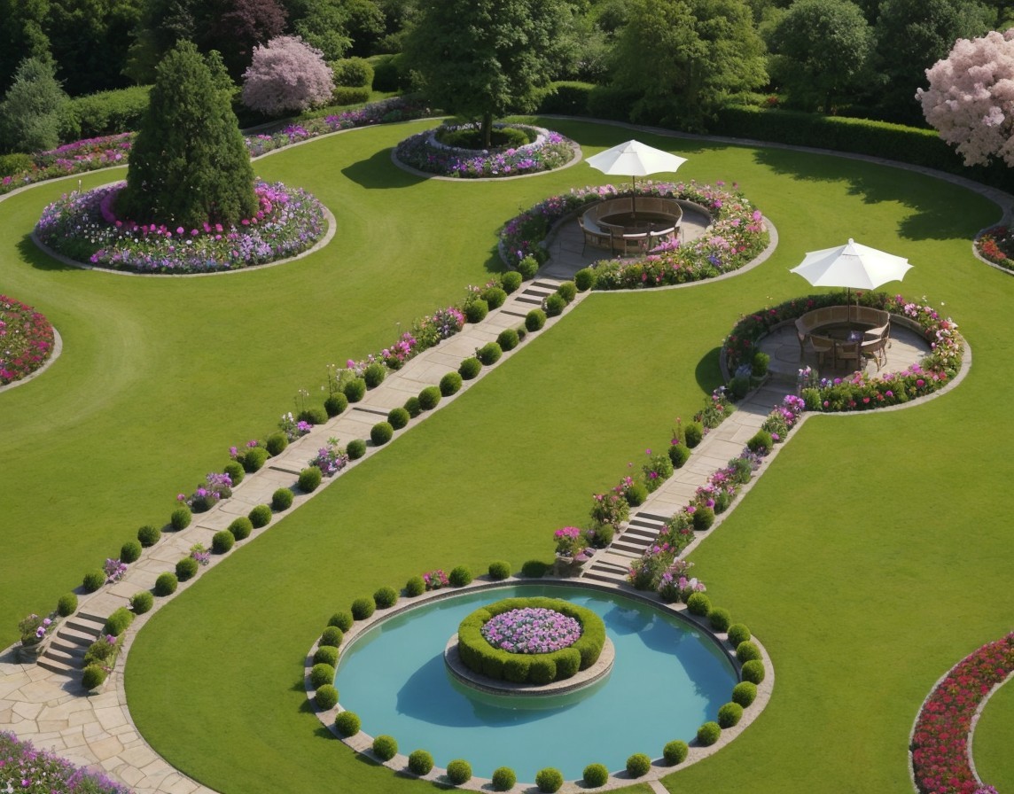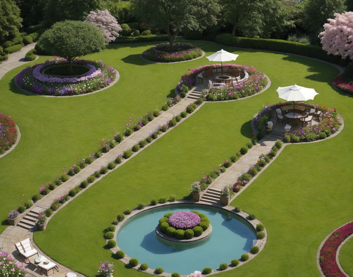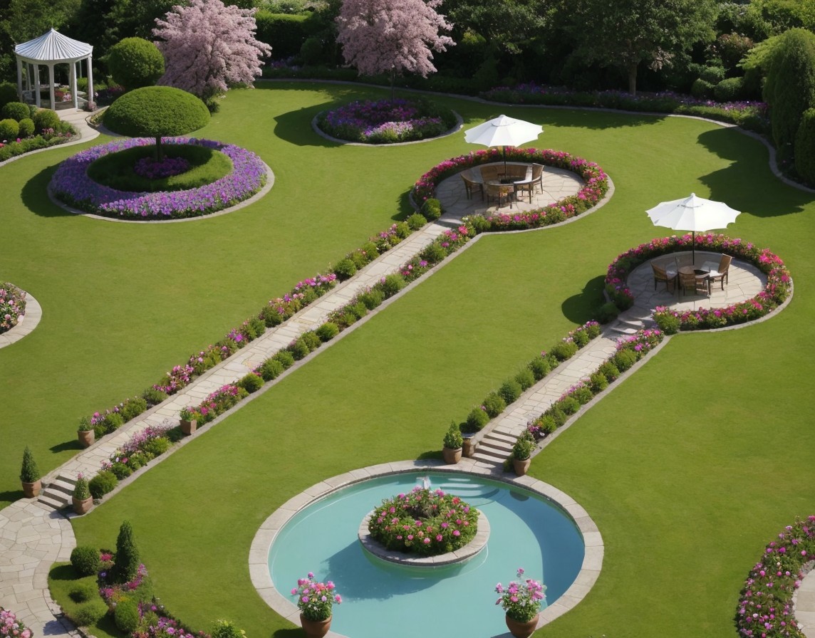 A well-manicured garden with flower beds, a fountain, pink trees, and seating areas under gazebos on a sunny day.