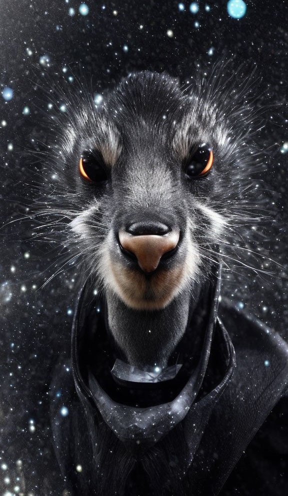 CGI anthropomorphic black sheep in futuristic attire on starry backdrop