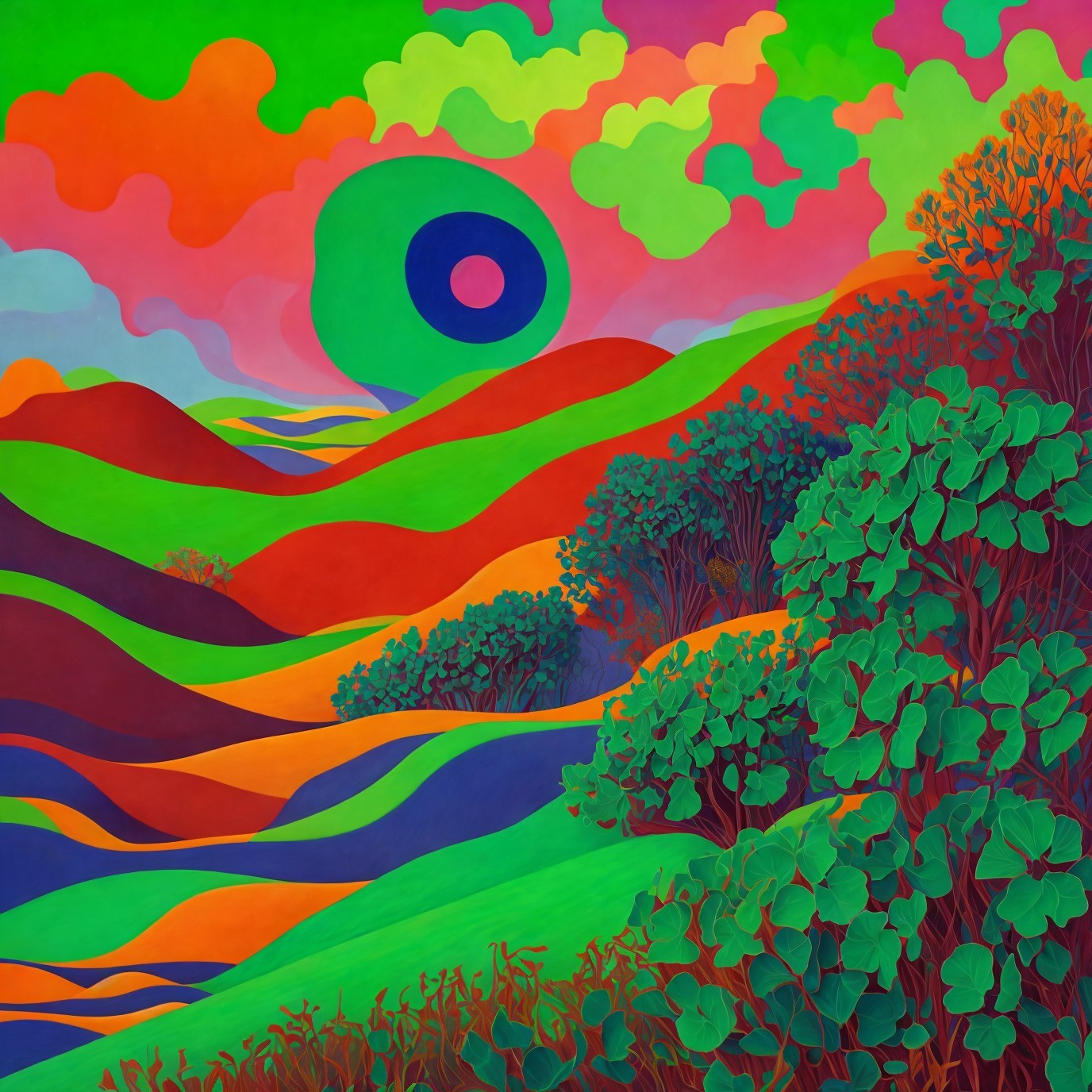 Vibrant, surreal landscape with rolling hills in multiple colors and a stylized sky with concentric circles.