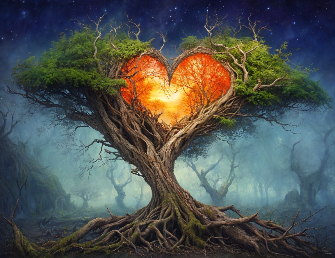 Two intertwined trees form a heart shape around a sunset, set in a mystical blue forest with starry sky backdrop.