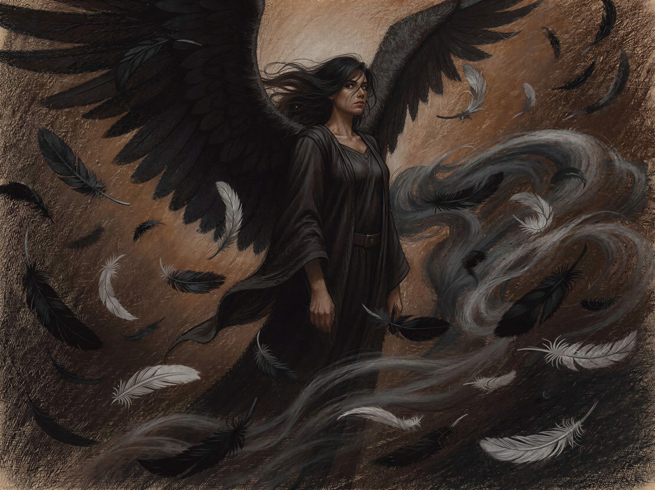 A mesmerizing illustration of a dark angel enveloped in a swirl of soft, delicate feathers, showcasing a blend of light and shadow through the rich textures of conte pastel.