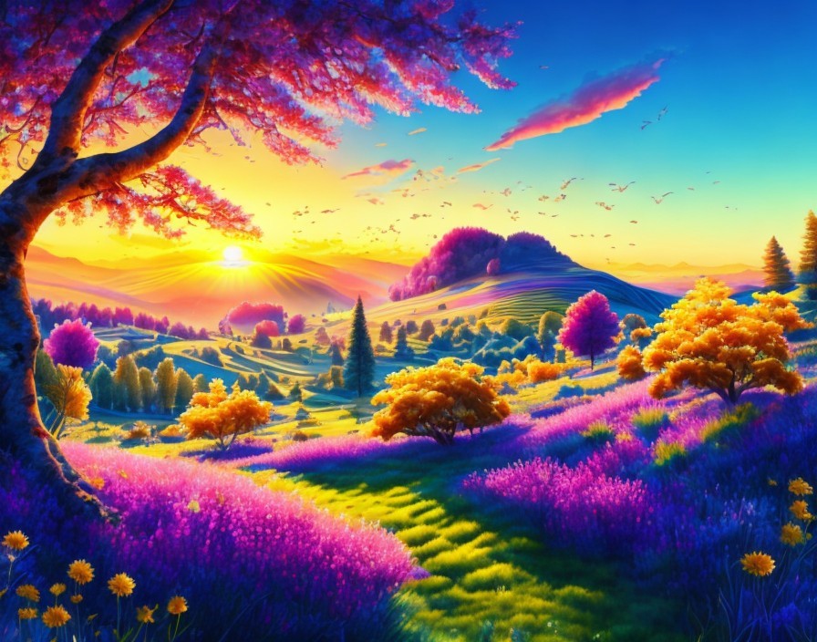 Prompt: Wide view, 3D watercolor patchwork, spectacular sunrise, beautiful meadow with numerous flowers with vibrant saturated colors, luxurious fruit trees, a deep blue pond, plants with delicate leaves in shades of sapphire blue and gold, golden sunrise rays shimmering over the scene, detailed intricate, satiny, high quality, elegant, highly detailed, glistening magic style, by Maxfield Parrish