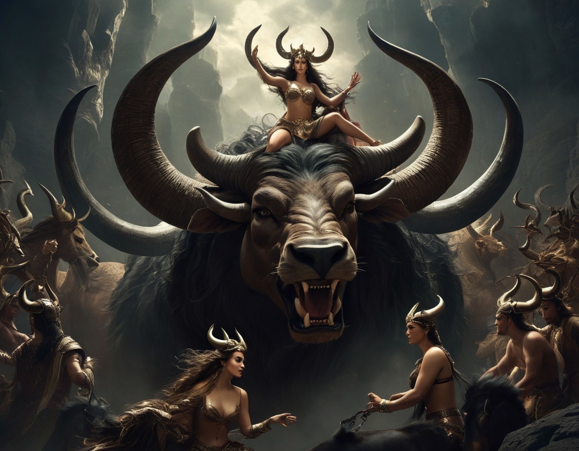 A majestic fantasy figure sits atop a giant beast with large horns, surrounded by a dramatic sky and fiery landscape.