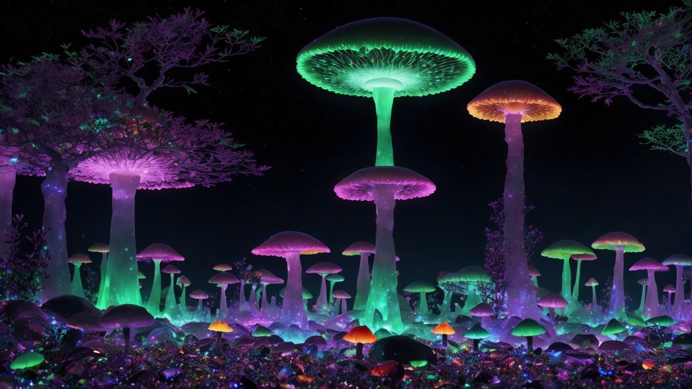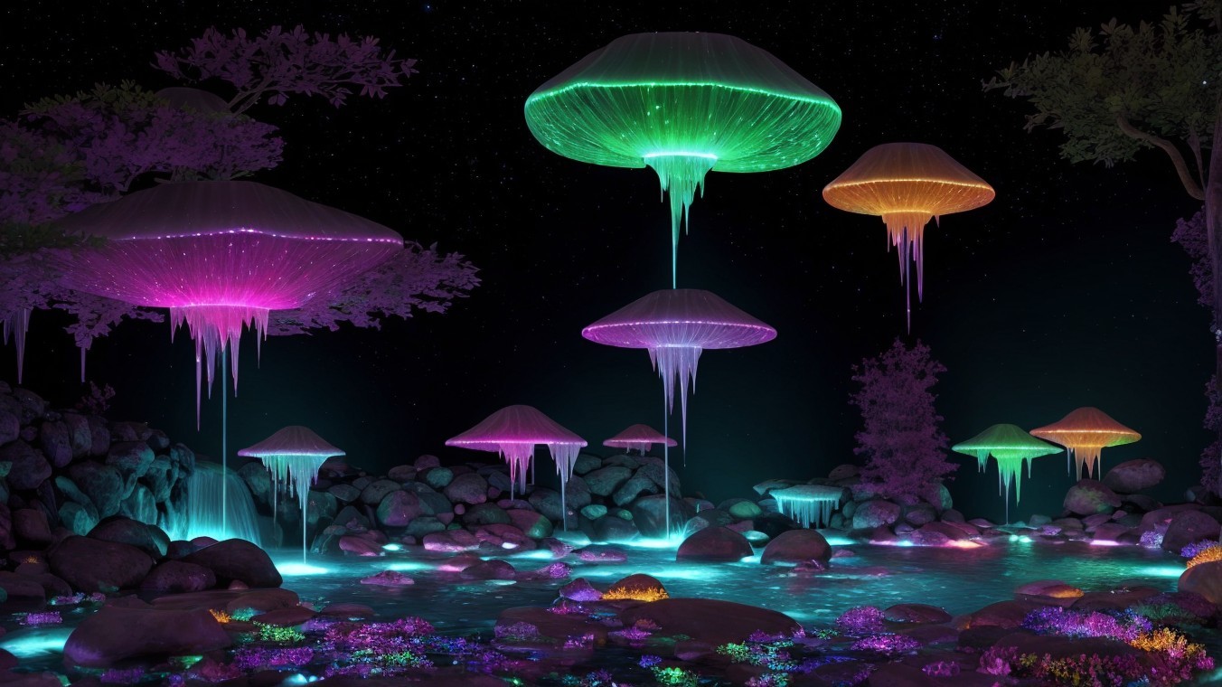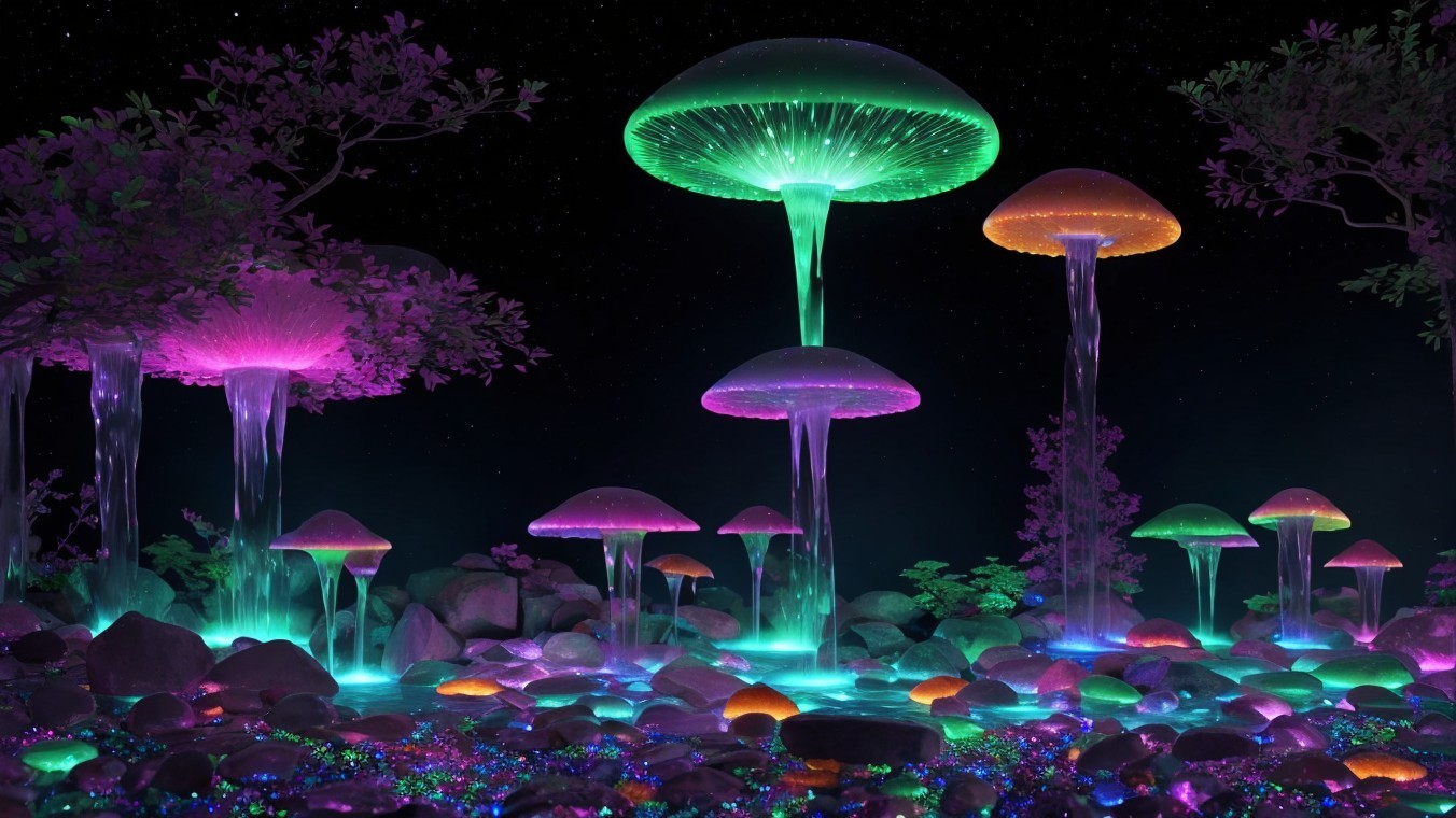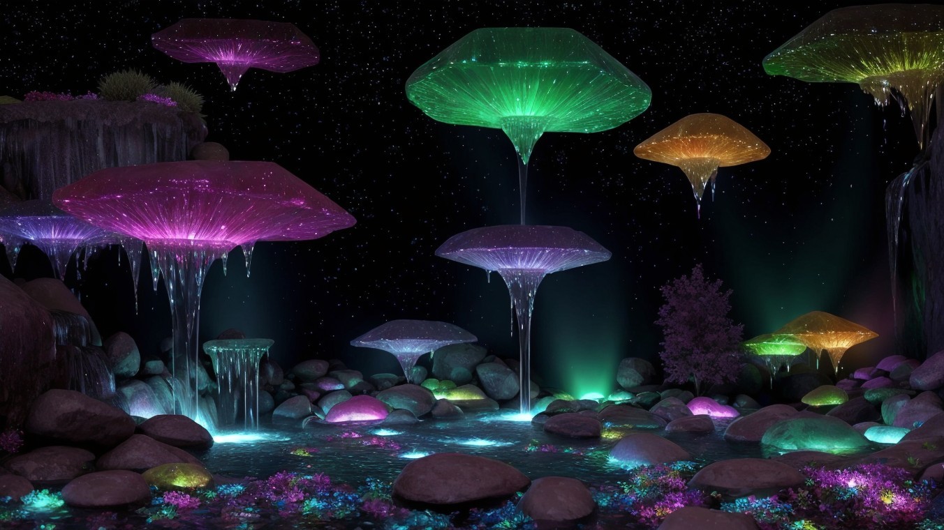 A mystical nighttime scene of a glowing, colorful waterfall cascading over illuminated rocks, creating a magical, serene atmosphere.