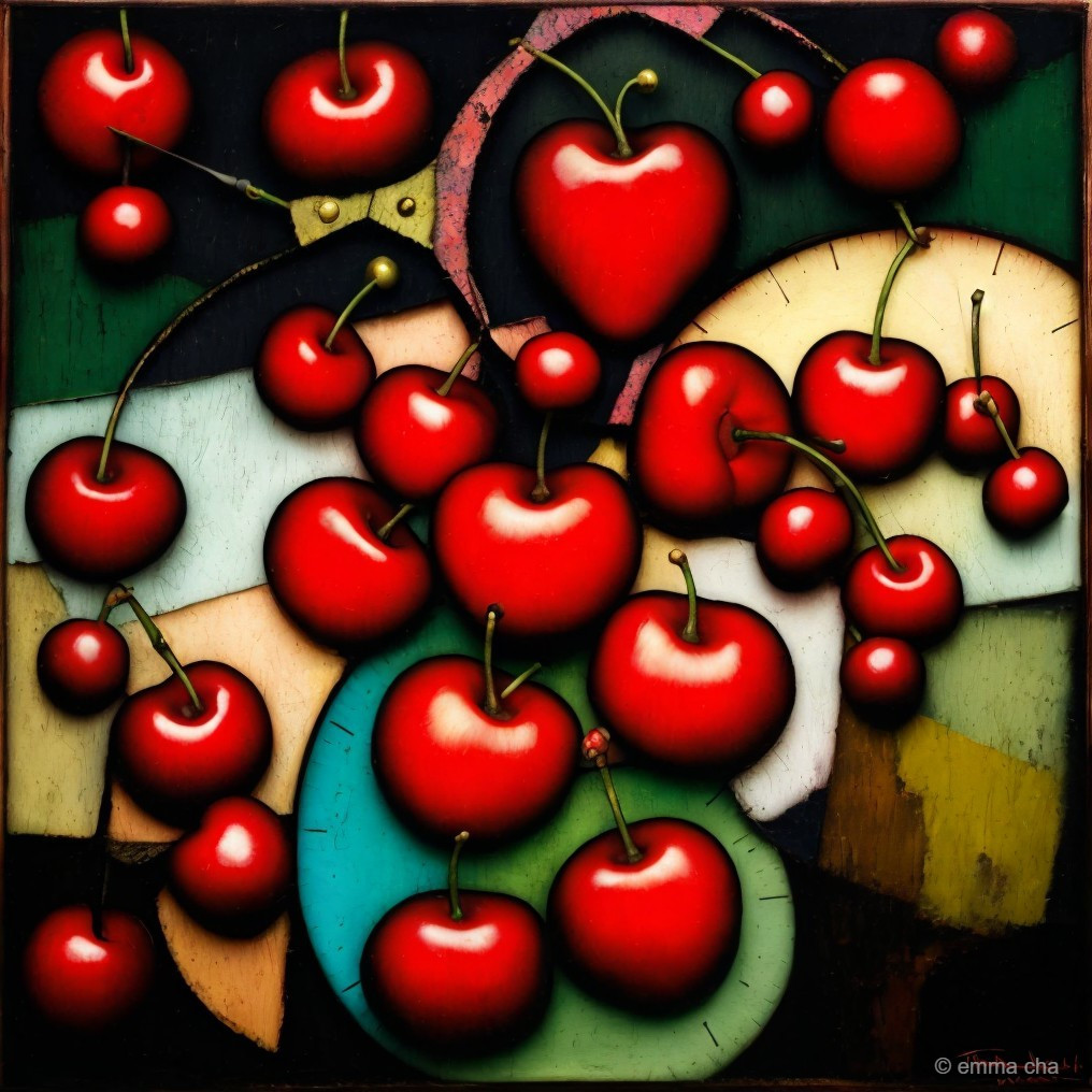 A vivid artwork of numerous red cherries with stems, varying in size, overlaid on a geometric, multicolored background with a textured appearance.
