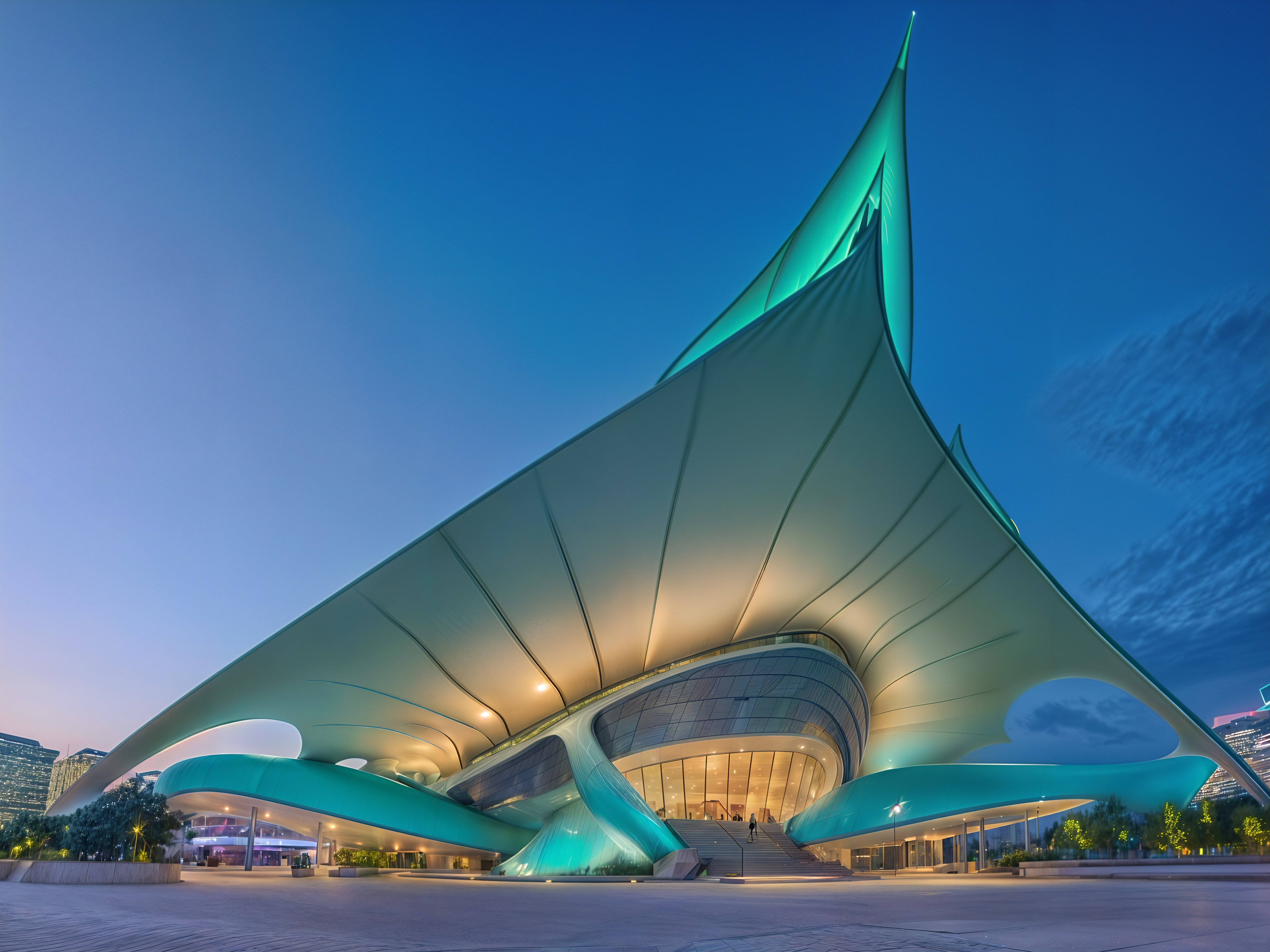 The image features a futuristic building with a sleek, curved design illuminated in blue hues against a twilight sky, showcasing modern architecture and a captivating entrance area.