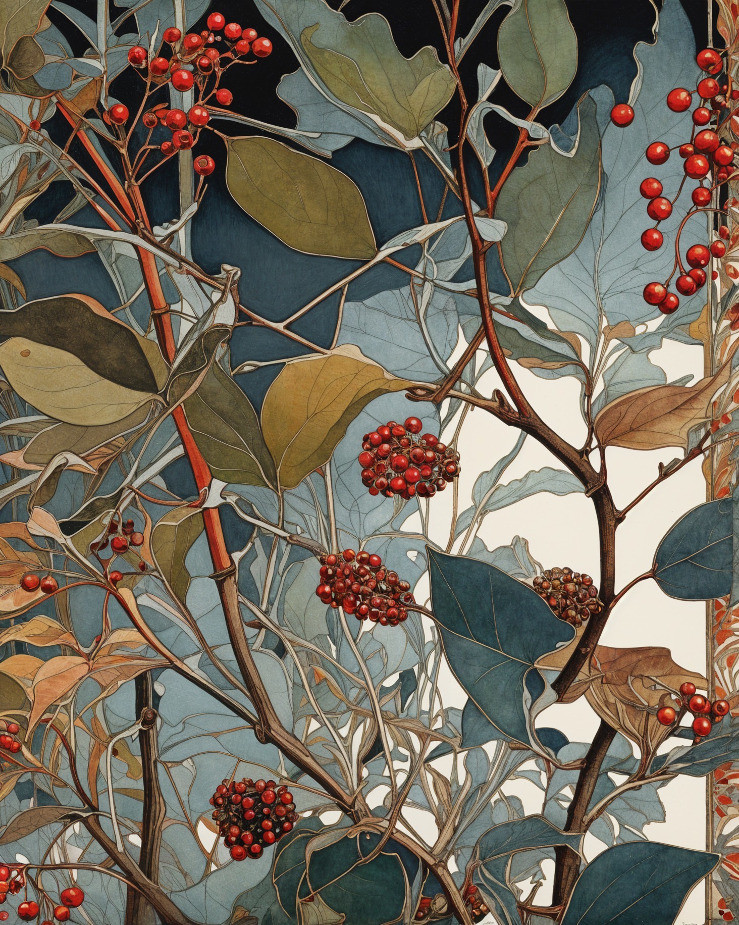 Create a detailed, abstract botanical painting depicting a cedar waxwing bird perched upon late autumn foliage and berries coated with frost.