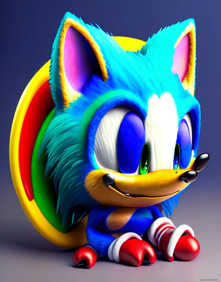 Blue-furred creature with orange eyes and bejeweled collar on purple background