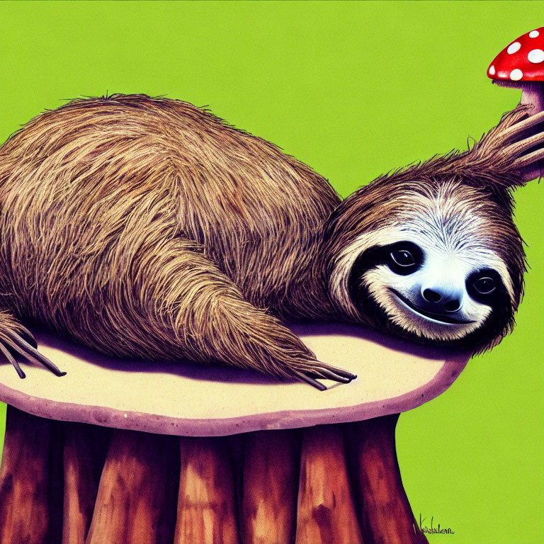 Smiling sloth on large mushroom with green background