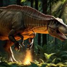 A powerful dinosaur stands in a lush forest, illuminated by beams of sunlight. Its muscular body, detailed scales, and fierce expression evoke the raw energy of the prehistoric world.
