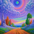 Vibrant Village Landscape with Colorful Sky and Lavender Fields