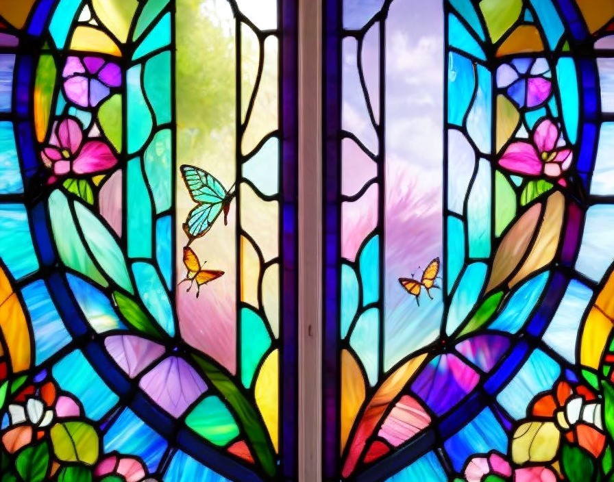 Vibrant Stained Glass Window with Butterflies and Flowers