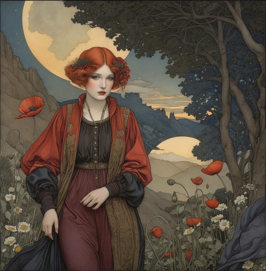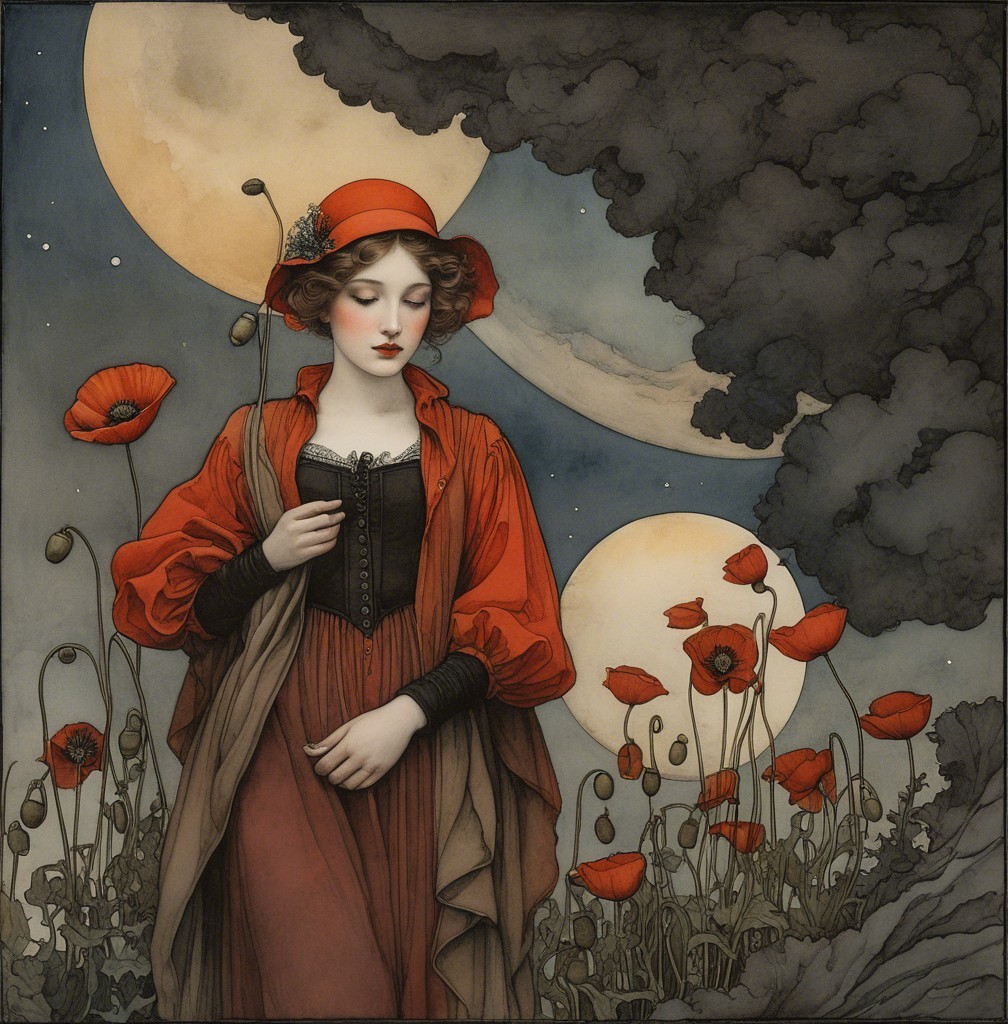 A woman in a striking red dress and hat stands confidently at a bar, holding a drink. Moonlit backdrops and orange flowers adorn the scene, creating a vintage, elegant atmosphere.