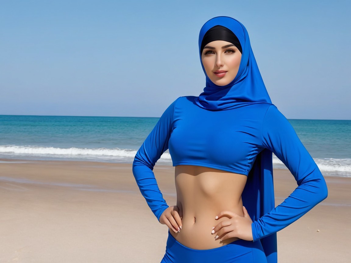 A confident woman stands on a beach, wearing a stylish blue swimsuit with a matching hijab. The clear blue sea and sky create a vibrant backdrop, emphasizing her poise and elegance.