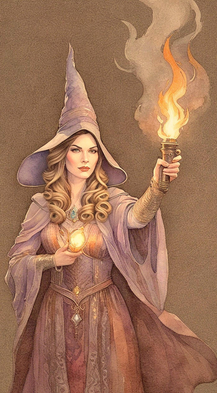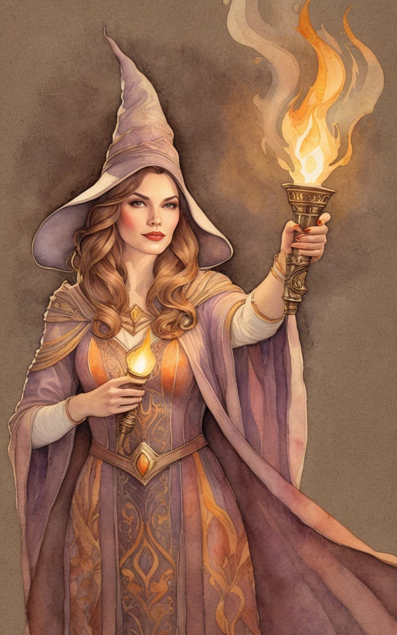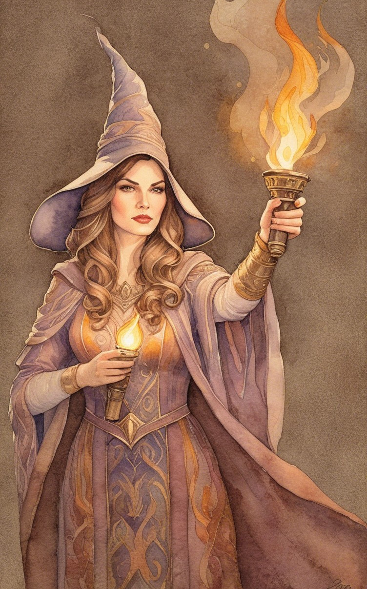 Stylized watercolor and ink painting. Upper body portrait of a sorceress holding up a torch. Interwoven textures of organic linework elements, intricate pointlism patterns merging with the portrait, offset printed effect enhancing depth, plasticity 1.3, Ray Donley's unique style evident in the fusion of vintage flair and steampunk artistry, Ho Baron's influence in the dark and mysterious lifelike representation by William Bradley, mip-mapping 1.3, displacement mapping 1.2, ambient occlusion 1.3, parallax occlusion 1.3, fantasy iconography, cel-shaded, sculpted, retrofuturistic sgraffito, divisionism, triadic color scheme light-pink light-grey light-black, grain an pointilism in background, uhd, hdr, dof, debeh, bokeh, brightness 1.3, subsurface scattering 1.5, finicky, 1880's graphic iconography reference, anthotype print, black brushstrokes adding depth, hues by Man Ray, line-art, thick textured layers, contoured, tactile feel, simplistic features, intricate detailing, warm coloring enhancing the fantasy ambiance. vivid coloring, close-up, slightly sculpted, flowing hair illusion, dethereal atmosphere, layers of fabric, liminal stencil, luminism, raytraced shadows 1.9, high resolution, color palette of metallic silver, deep blacks, hints of light brown, dramatic lighting casting shadows and highlights, cel-shaded, sculpted, retrofuturistic, divisionism. smeary, graphic emphasis, vintage iconography reference, anthotype print, black brushstrokes adding depth, hues by Man Ray, line-art, thick textured layers, contoured, tactile features, intricate detailing, warm coloring enhancing the fantasy ambiance. warm coloring, close-up, slightly sculpted, flowing hair illusion, dethereal atmosphere, layers of fabric that blend with turbulent patterns