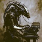 A dramatic scene featuring a man in formal attire reclining on a pedestal, while a menacing, anthropomorphic figure with a bird-like head looms over him, creating an intense, surreal atmosphere.