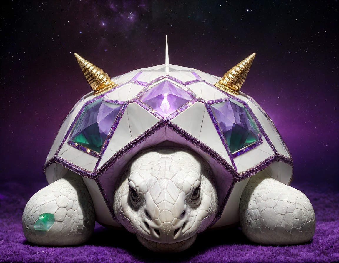 A fantastical shelter with a geometric, crystalline shell and gold accents against a starry purple backdrop, surrounded by purple flowers.