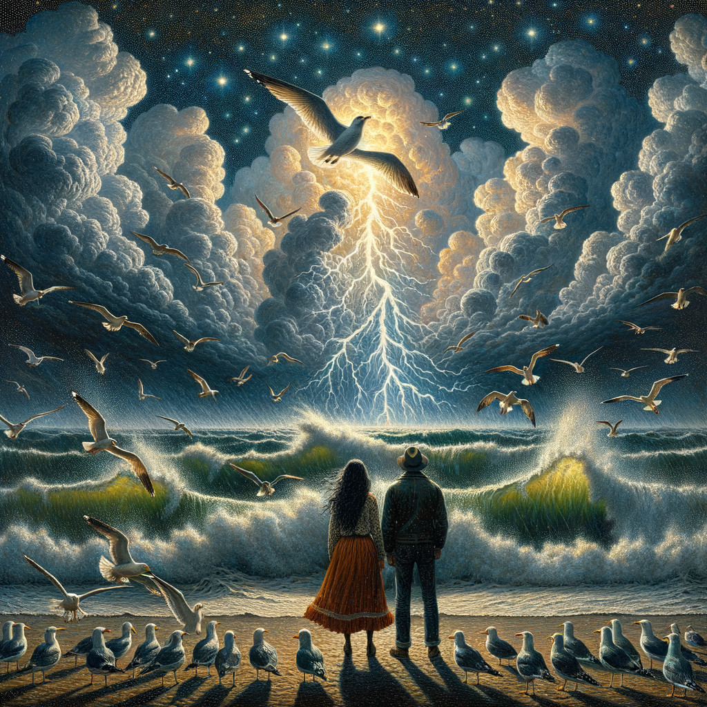 It startles the seagulls into the sky, causing of flurry of wings around us as I look at him.lightning with a shape of thunder at rainy night.