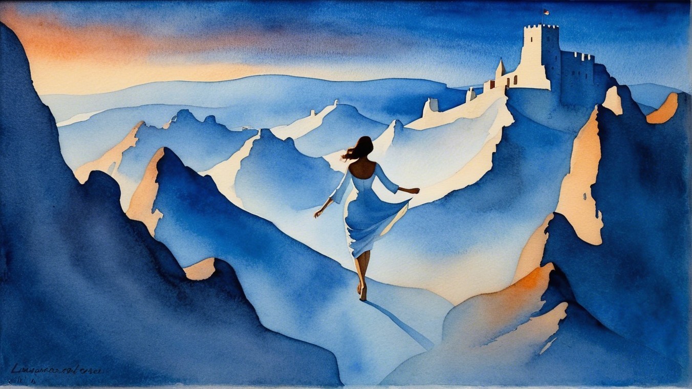 dreamy hazy breezy ethereal, wet-on-wet watercolor effect, glowing blue mist, soft bokeh, faded vintage textures, melancholic