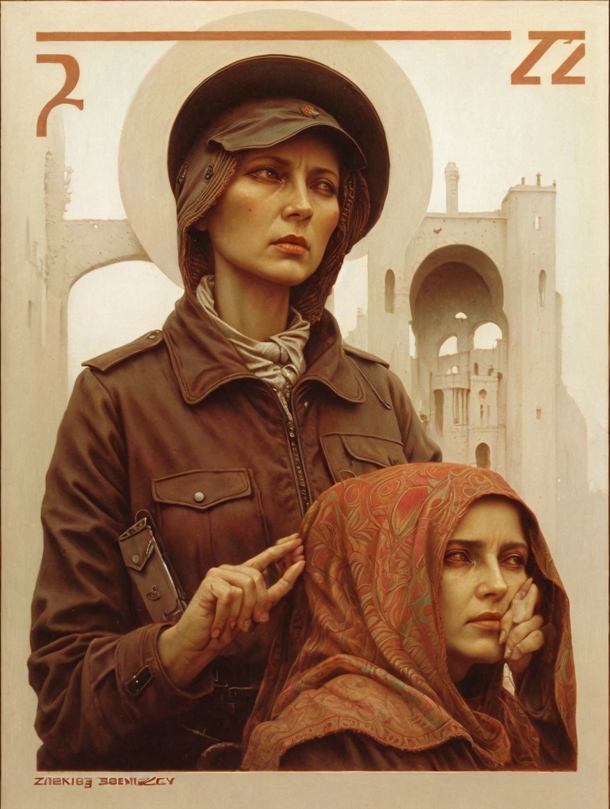 Portrait of two women: one with brown shawl and orange flowers, the other looking away