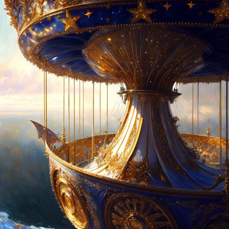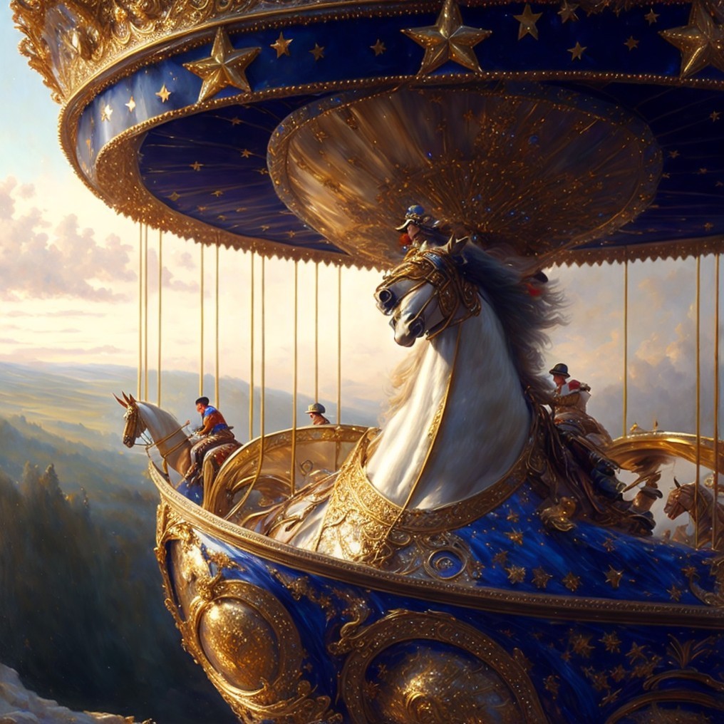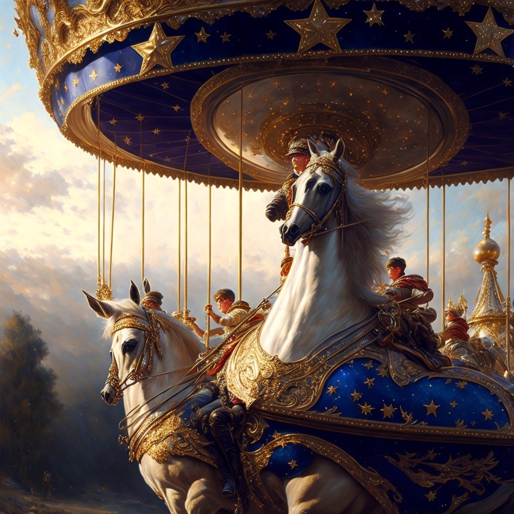 A vibrant artwork depicting a child and a knight on carousel horses under a gilded canopy against a cloudy sky.
