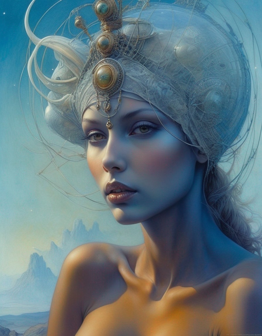 Portrait of a young girl with a serene expression, styled hair, against a cloudy sky and distant landscape background.