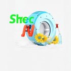 Prompt: generate a logo for a laundry service business with the name 'Shee N Shee', use blue, red, yellow and green also add an image of a washing machine