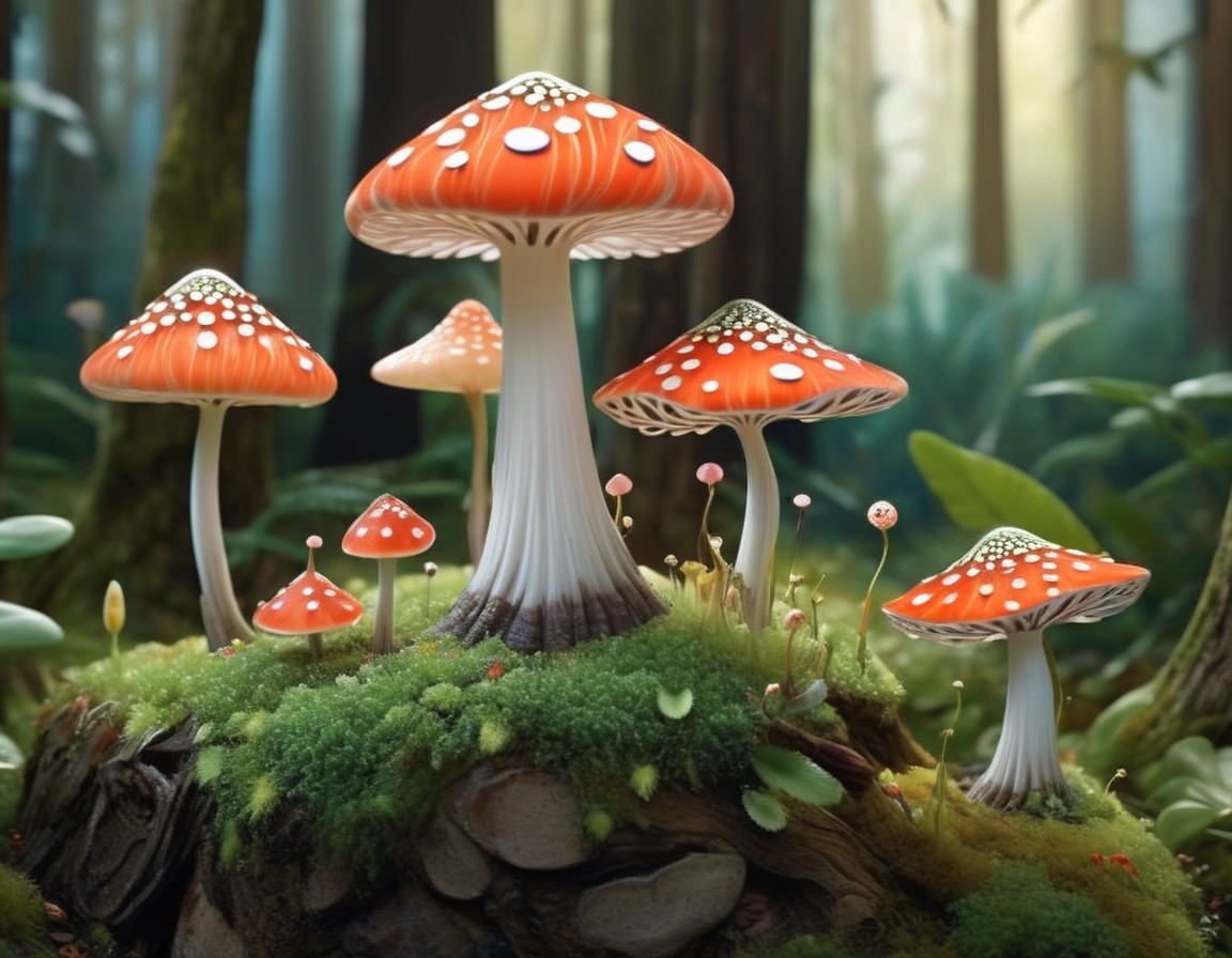A vibrant digital illustration of red and white spotted mushrooms in a dense, mystical forest setting.