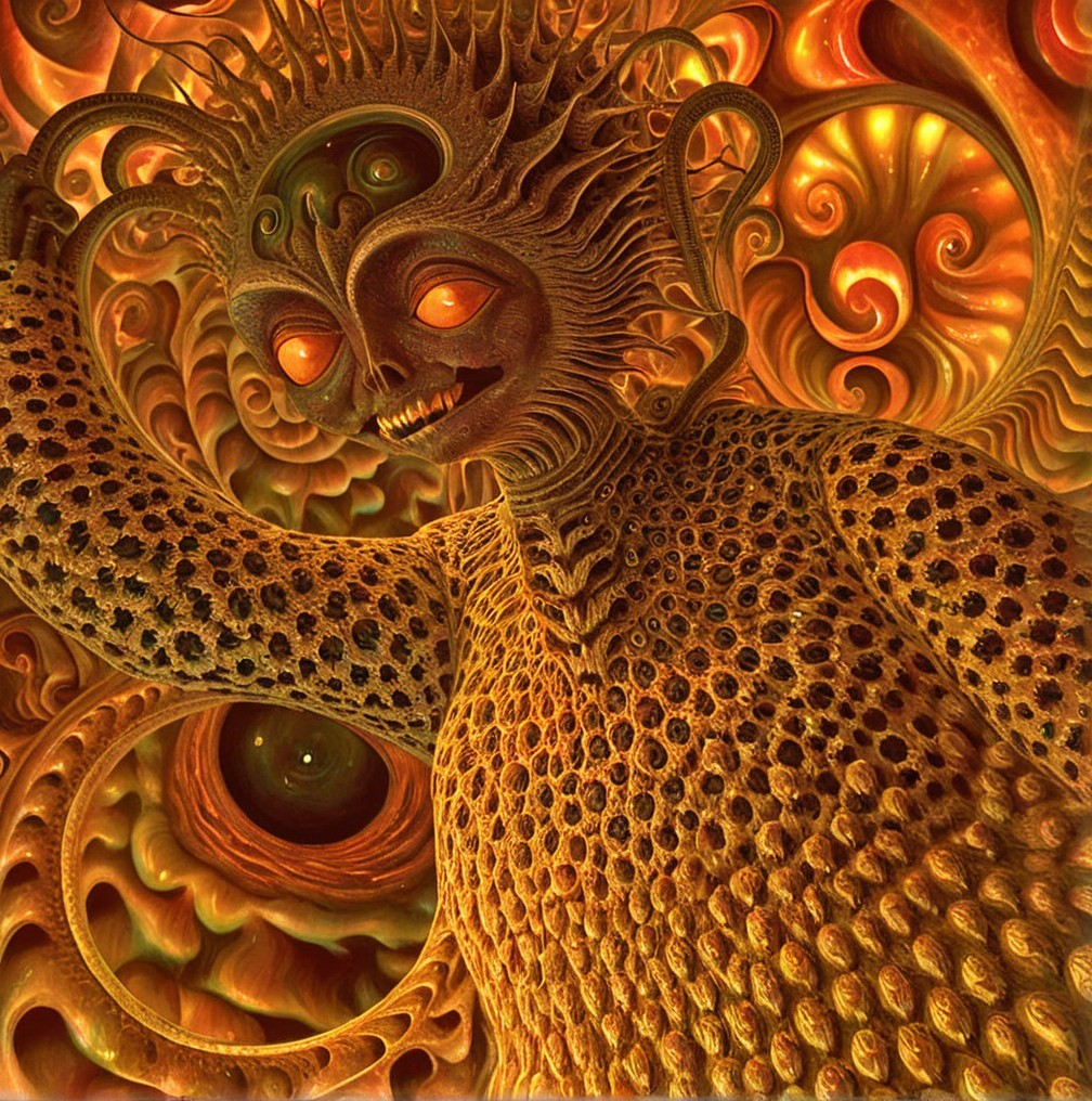 An imaginative scene features a furry, orange-hued creature resembling a cat, set against a surreal landscape with swirling patterns and a vibrant celestial backdrop.
