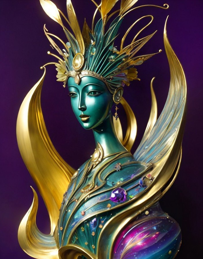 Celestial figure with golden ornaments in cosmic-themed illustration