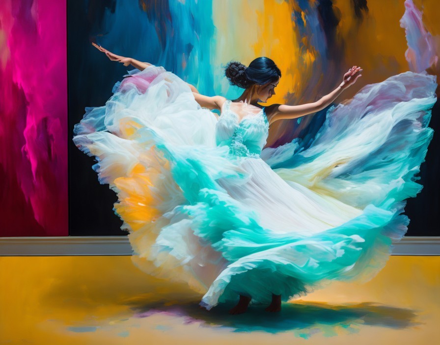 Prompt: "Action painting. The young woman practising solo modern, intuitive dance in gauzy dress. Shot in movement, oil on canvas.