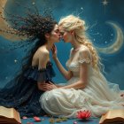 Two young women in elegant gowns, one navy and one white, share a tender kiss over an open book. The background features a whimsical night sky with stars and moons, surrounded by flowers.