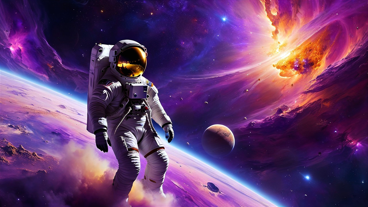 An astronaut floats through a vivid cosmic landscape, surrounded by swirling galaxies, vibrant nebulae, and distant planets, creating a breathtaking scene of space exploration and wonder.