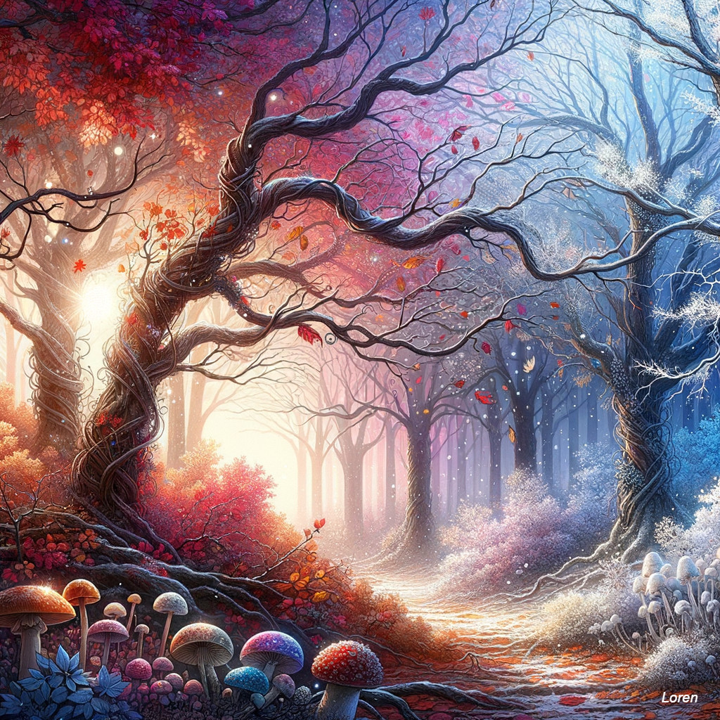 A vibrant forest with twisted trees, a sunbeam pathway, colorful leaves, and mushrooms.
