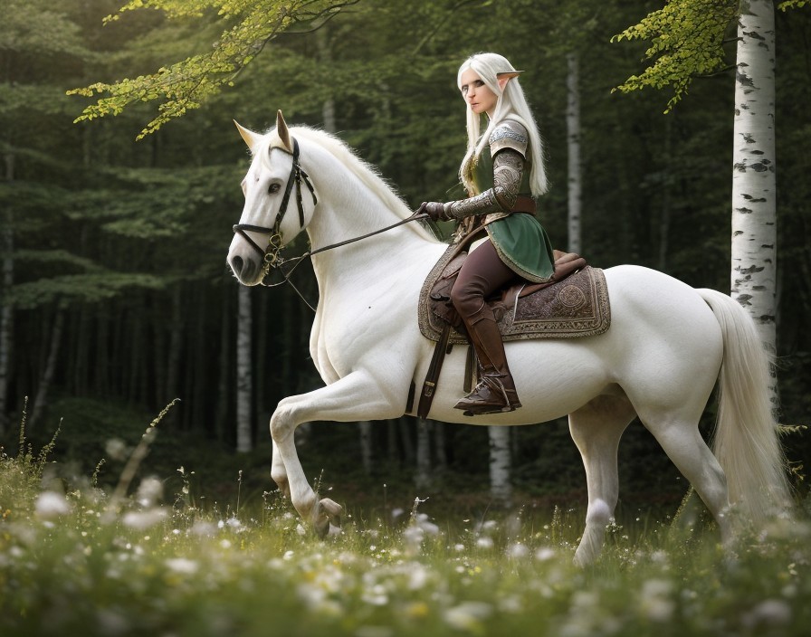 A person in elf-like cosplay riding a white horse in a forest setting.