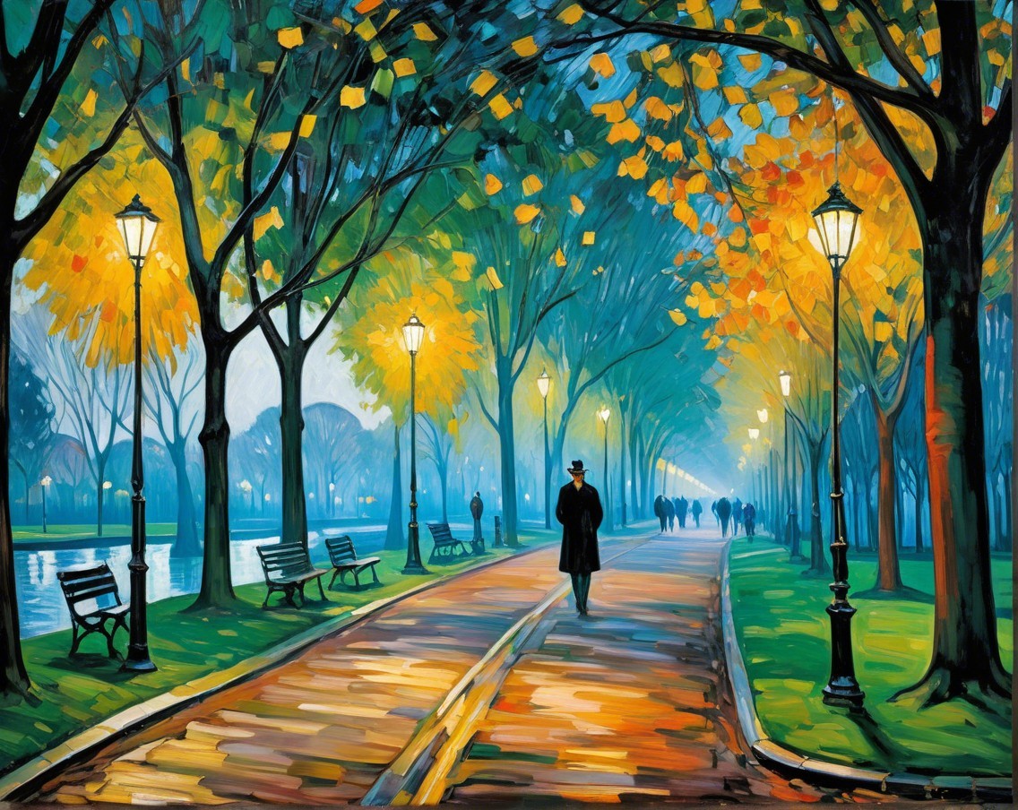 A pathway through a park, lined with colourful green and yellow trees and lampposts. People are strolling along the path, surrounded by soft twilight, creating a tranquil, picturesque scene.
