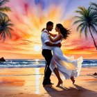 Pareja bailando kizomba, playa tropical, puesta de sol rojiza, olas espumosas, arena dorada, palmeras en el fondo, cielo en tonos cálidos, vestimenta elegante, movimiento fluido, expresiones alegres, acuarela detallada, estilo realista con toque romántico, alto contraste de colores, iluminación suave, arte inspirado en la naturaleza, enfoque en la conexión de la pareja, técnica de acuarela experta, calidad excepcional.