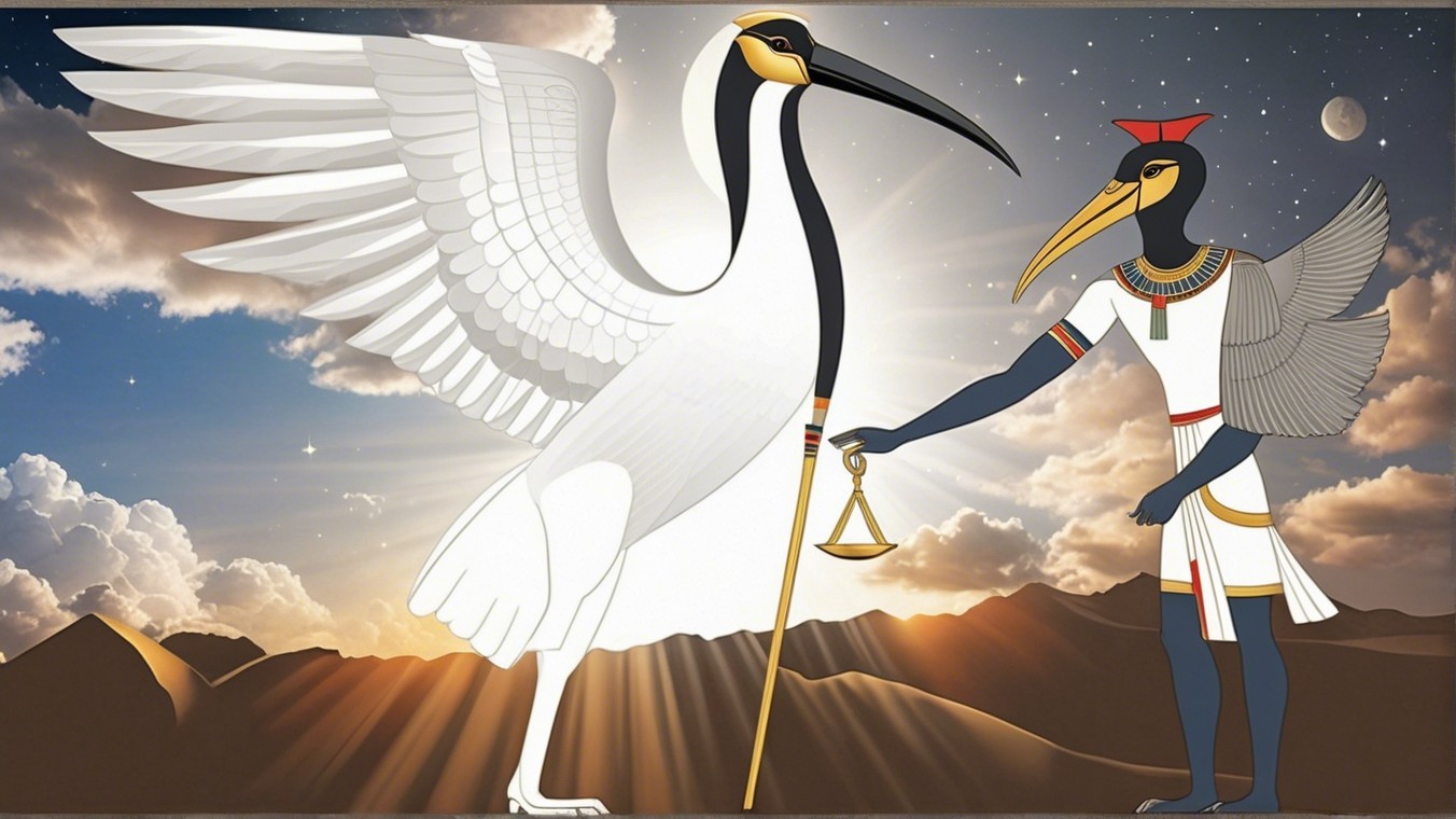 In the style of Egyptian hieroglyphics create an image of Thoth weight the HEART of JESUS Thoth symbolizes wisdom, knowledge, writing, magic, the moon, and cosmic order, often depicted as an ibis-headed man or baboon. He represents the invention of hieroglyphs and language, mediating divine disputes, and is credited with keeping the balance of the universe and ensuring justice through the "Weighing of the Heart" ceremony.