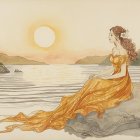 A serene scene captures a woman in a flowing yellow dress sitting on a rock by the seaside. The sun sets in the background, reflecting on tranquil waters, with gentle hills framing the view.