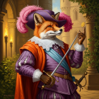 The image features a dapper fox dressed as a noble, wearing a vibrant outfit with a feathered hat. It holds a coin and a sword, exuding charm and confidence in a regal setting.