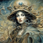 A captivating portrait of a woman with flowing hair and intricate details, surrounded by swirling patterns and soft colors, exuding a mystical and ethereal aura with a serene expression.
