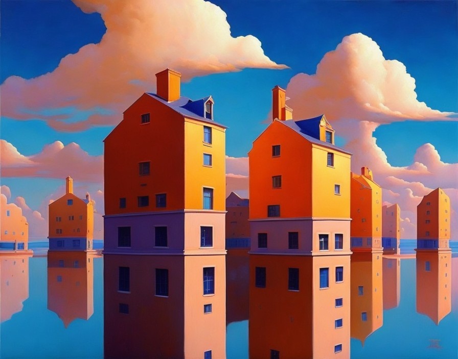 Surreal Landscape with Orange Houses and Reflections