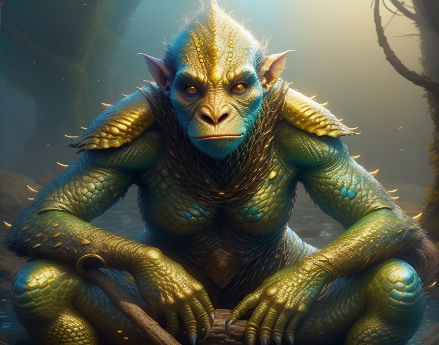 a great bog creature of the north, the Slag. Wise and incredible creatures, covered from head to toe in iridescent golden scales. round head