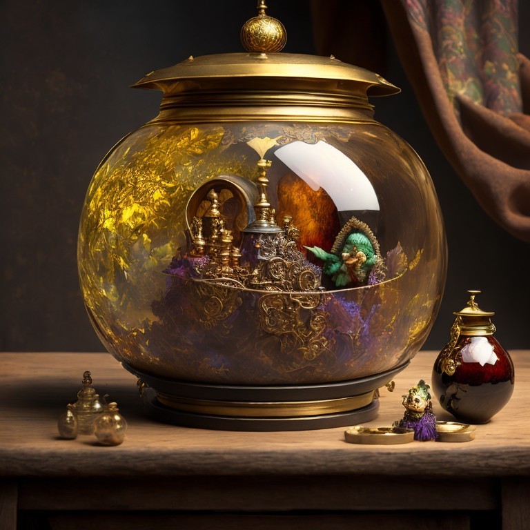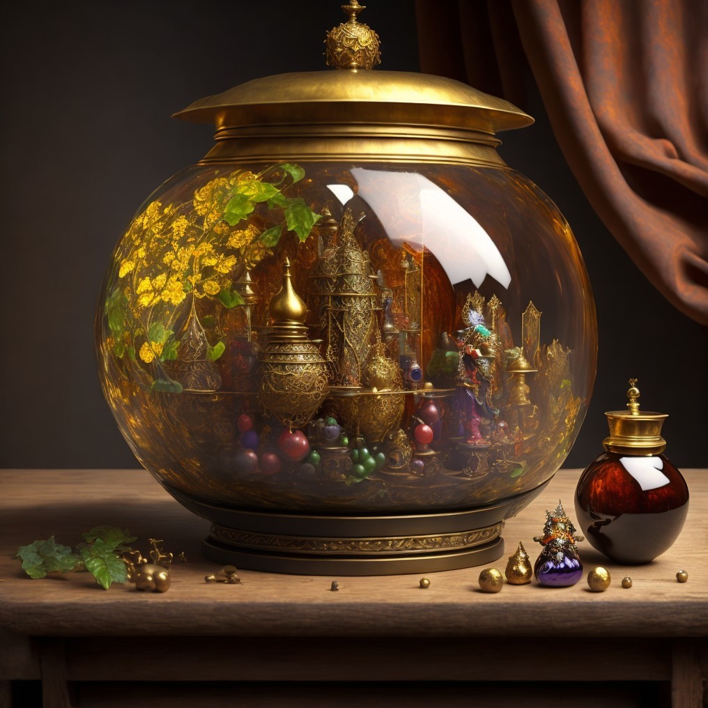 A digital artwork portraying a glass terrarium containing ornate, miniature fantasy buildings with ivy and potion bottles outside.